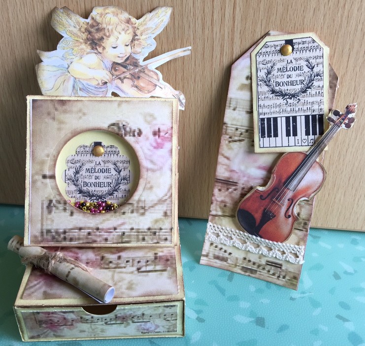 Boite chevalet et marque page réalisés lors de l'atelier scrapbooking du mois de juillet 2017.