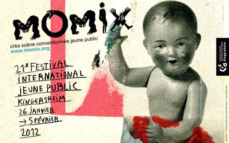 Partie supérieure de l'affiche officielle du 21e Festival Momix de Kingersheim. Une poupée ancienne, le logo Momix et le titre écrit avec une écriture d'enfant