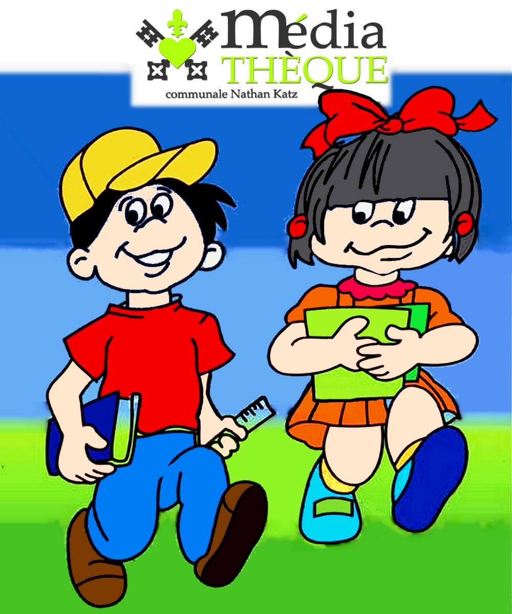 Deux écoliers (garçon et fille) sympa et colorés sur fond de logo de la médiathèque Nathan Katz de Waldighoffen