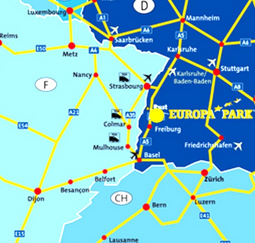 Carte de la région de l'Europapark, grand parc d'attractions en Allemagne, proche de la frontière française