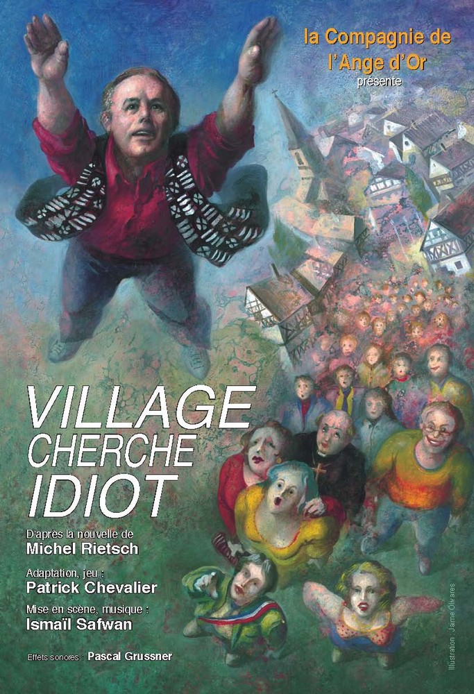Affiche pour le conte " Village cherche Idiot " représentant le village de Balbelheim avec Patrick Chevalier volant dans les airs.