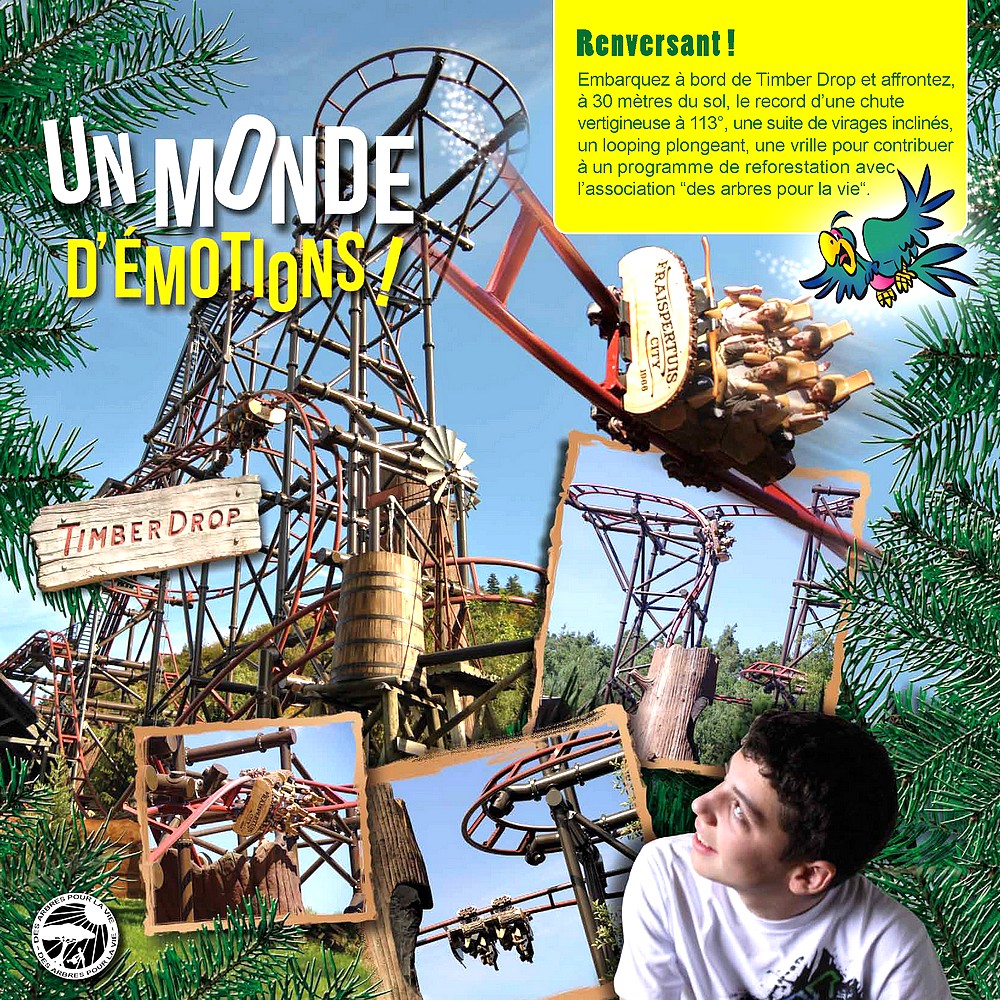 Dessin extrait de la brochure du Parc de Fraipertuis City, représentant l'attraction Timber Drop de ce parc des Vosges