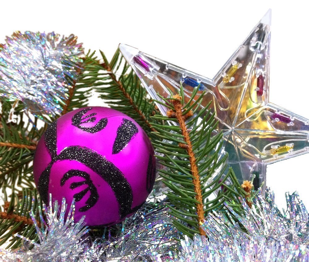 Une boule de Noël rose sombre sur une branche de sapin, avec une guirlande et une étoile transparente