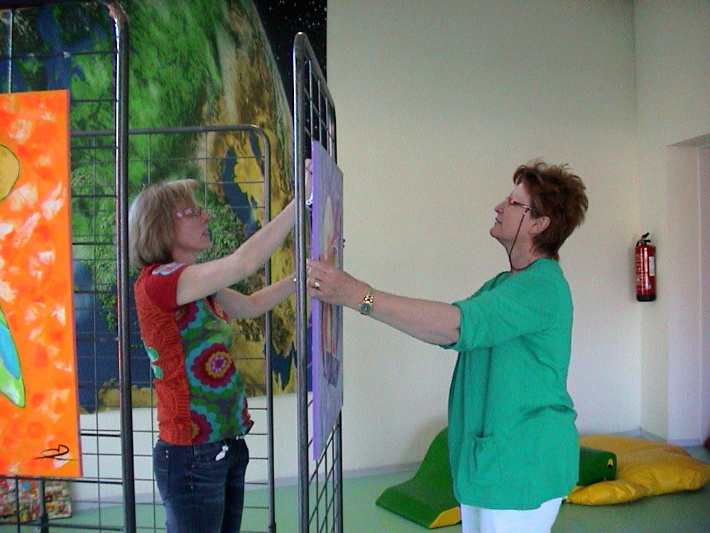 L'accrochage des toiles de Christiane Demuth est plas facile avec l'aide de Christiane Vallin