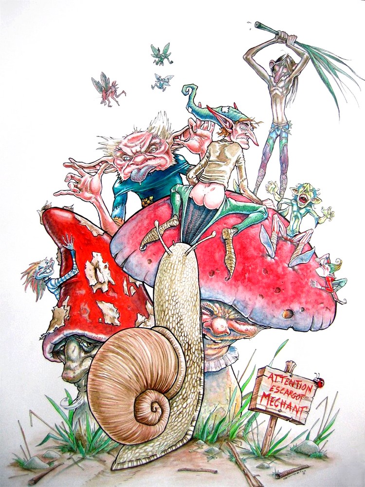 Le méchant escargot s'attaque aux lutins crétins sur un champignon
