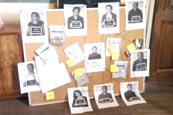 Sur un tableau, les photos des protagonistes d'un crime sont affichés. Enquête pour la Murder Party de la médiathèque
