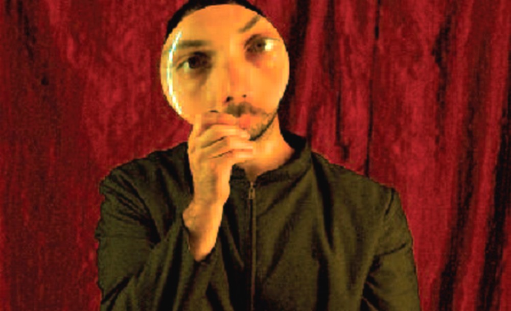 Photo du spectacle "Mademoiselle au bord du loup" donné à la salle associative du Forum de Waldighoffen dans le cadre du Festival Momix 2011 avec la Médiathèque - un homme et son visage agrandi par une loupe