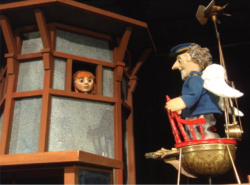 "Mademoiselle pas assez" , la nouvelle création de Nathalie Roques, auteur, manipulatrice et interprète. Deux marionettes dans leur décor : le viel ange-gardien et Mademoiselle pas assez