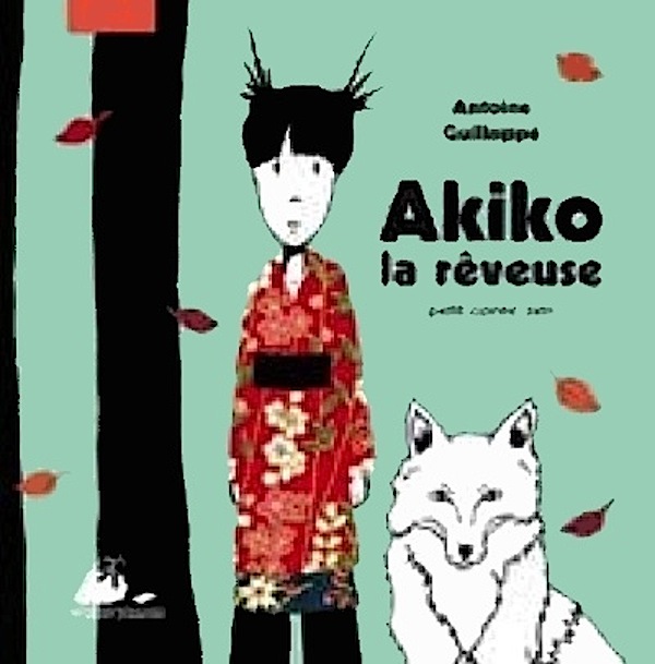 Akiko la rêveuse en kimono rouge, sur fond bleu-vert, avec le loup