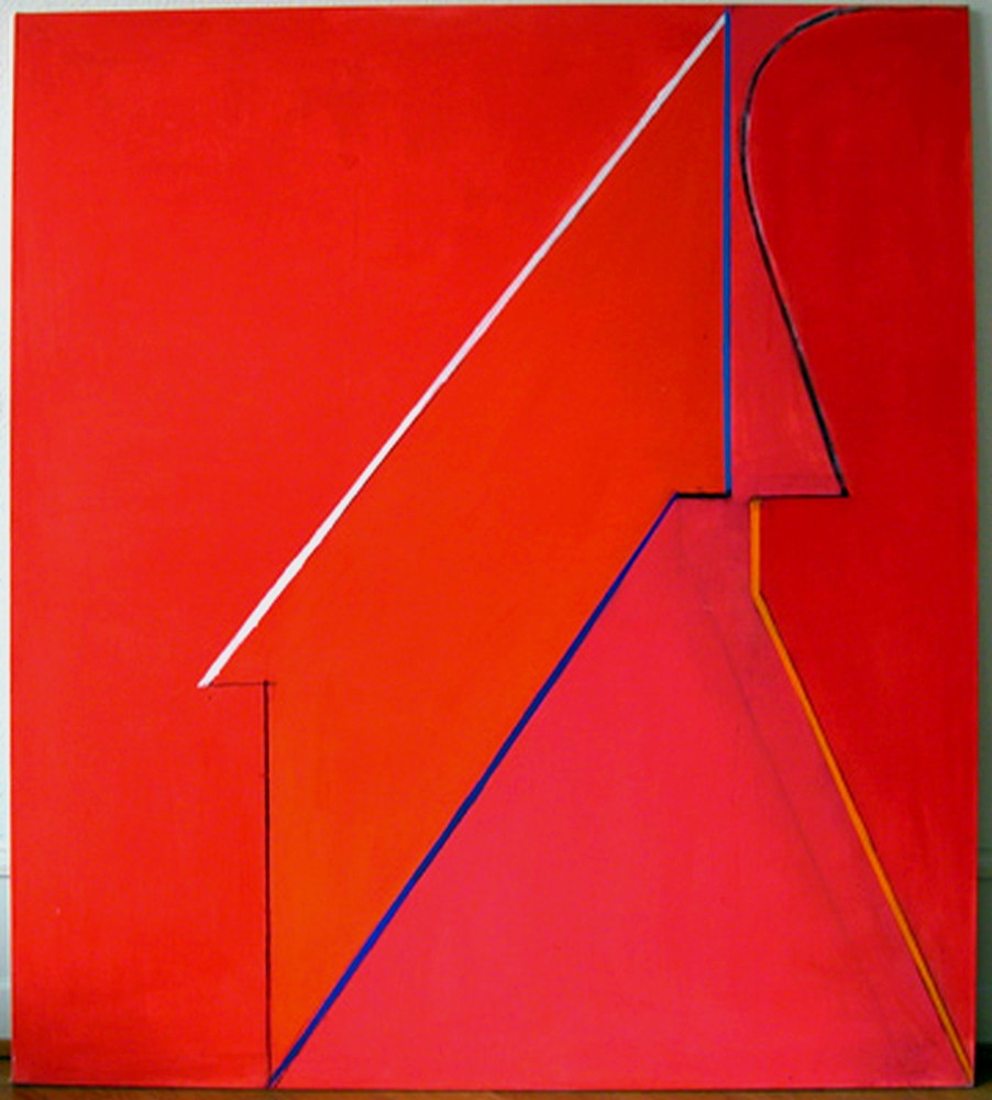 Toile de la peintre suisse Cristina Spoerri, lignes géométriques colorées sur fond rouge