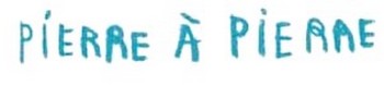 Titre du spectacle "Pierre à Pierre" proposé par le Festival Momix 2012 à la Médiathèque de Waldighoffen. Titre en écriture d'enfant, de couleur bleue.