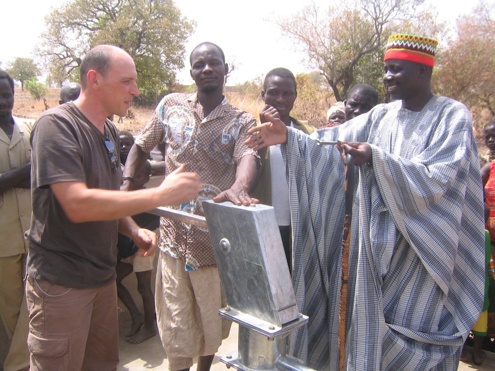 Des membres de l'association Sundgau Burkina Faso de Steinsoultz et des villageois en train d'actionner le nouveau puits, mis en place en 2007.