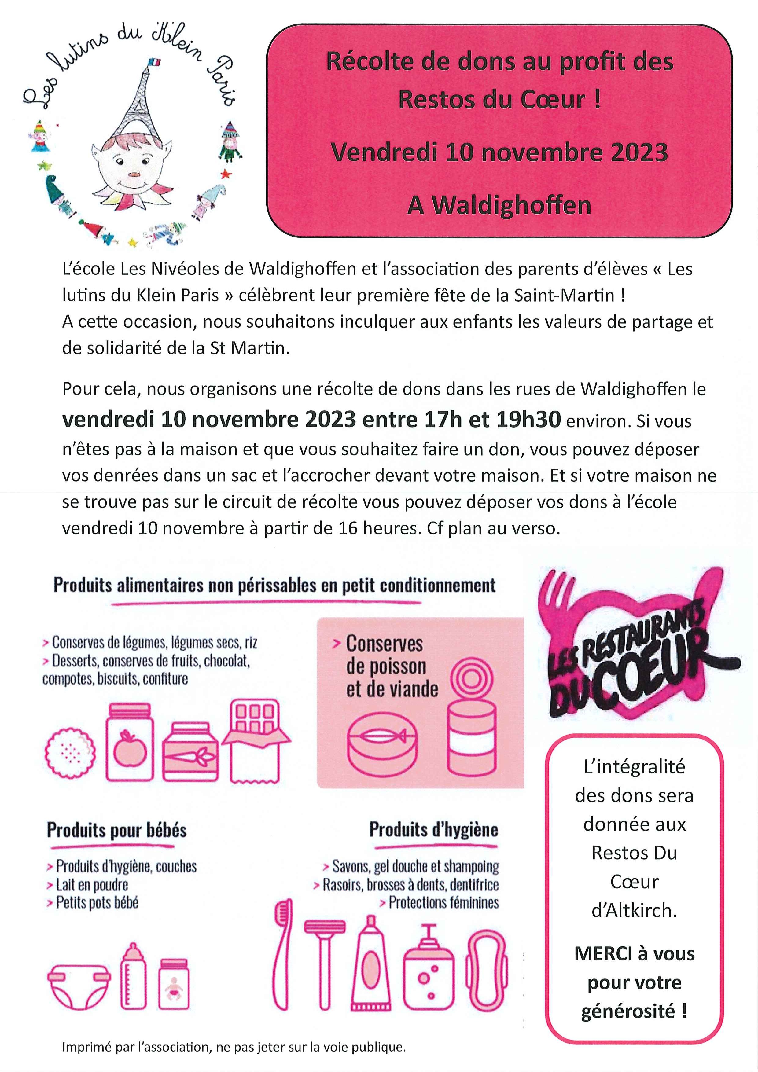 Vous êtes ici : Accueil Vie associative Les associations de Waldighoffen Association scolaire "Les Lutins du Klein Paris" Fichiers et images Affiche récolte de dons au profit des Restos du Coeur