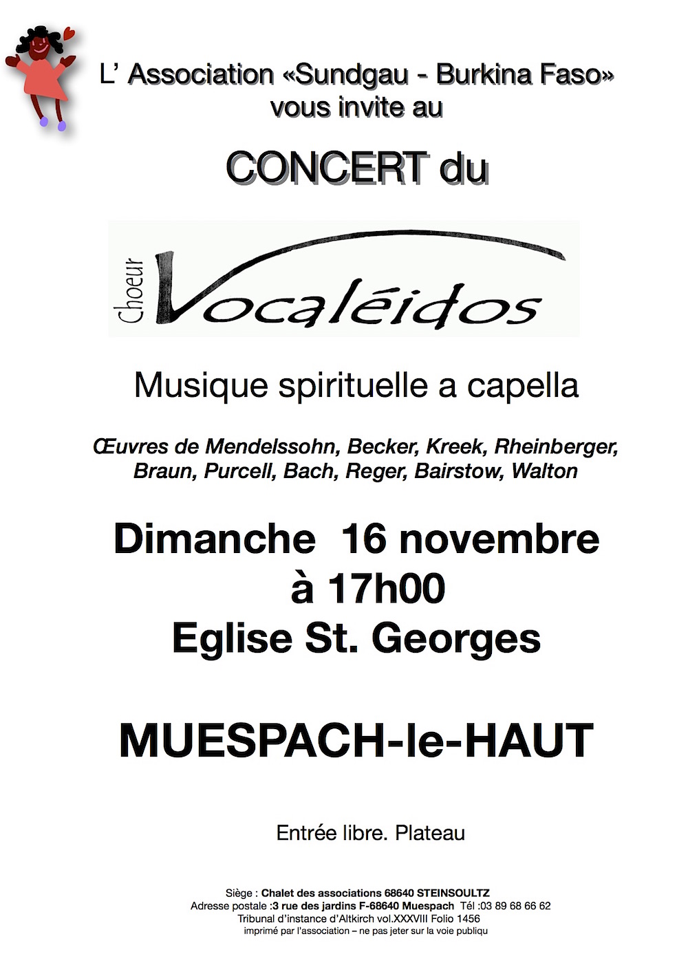 Vous êtes ici : Accueil Vie associative Les associations de Waldighoffen Ensemble vocal Arpège Les photos, images et documents de la chorale Arpège Affiche concert Vocaleidos pour le Burkina Faso