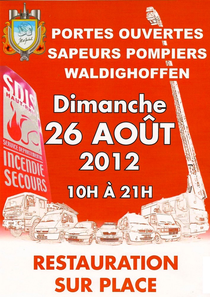 Portes ouvertes le 26 août 2012 à la caserne des pompiers de Waldighoffen (texte blanc sur fond rouge)