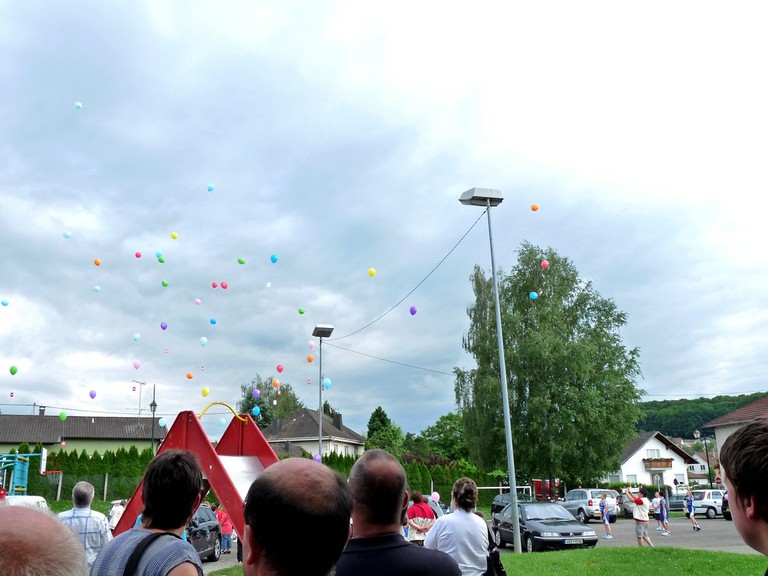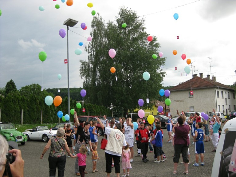 - Photo des participants au moment du lâcher de ballons dans la cour de l'école de Waldighoffen à l'occasion de la Caravane du sang.