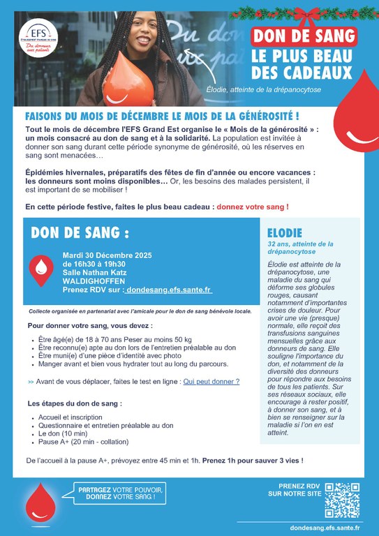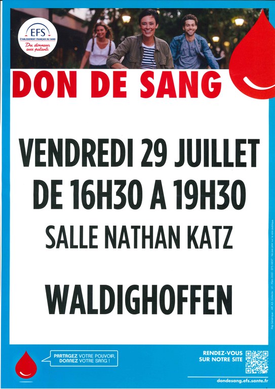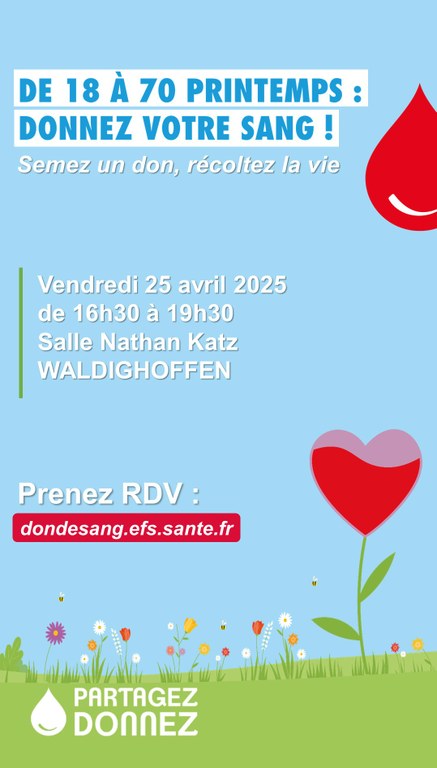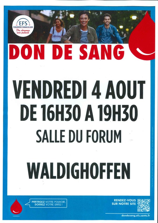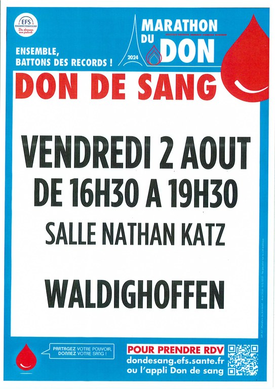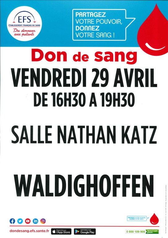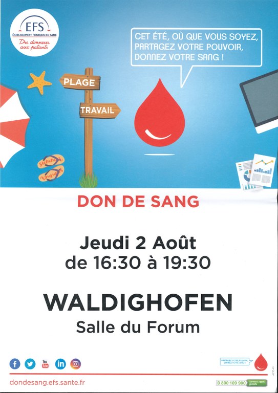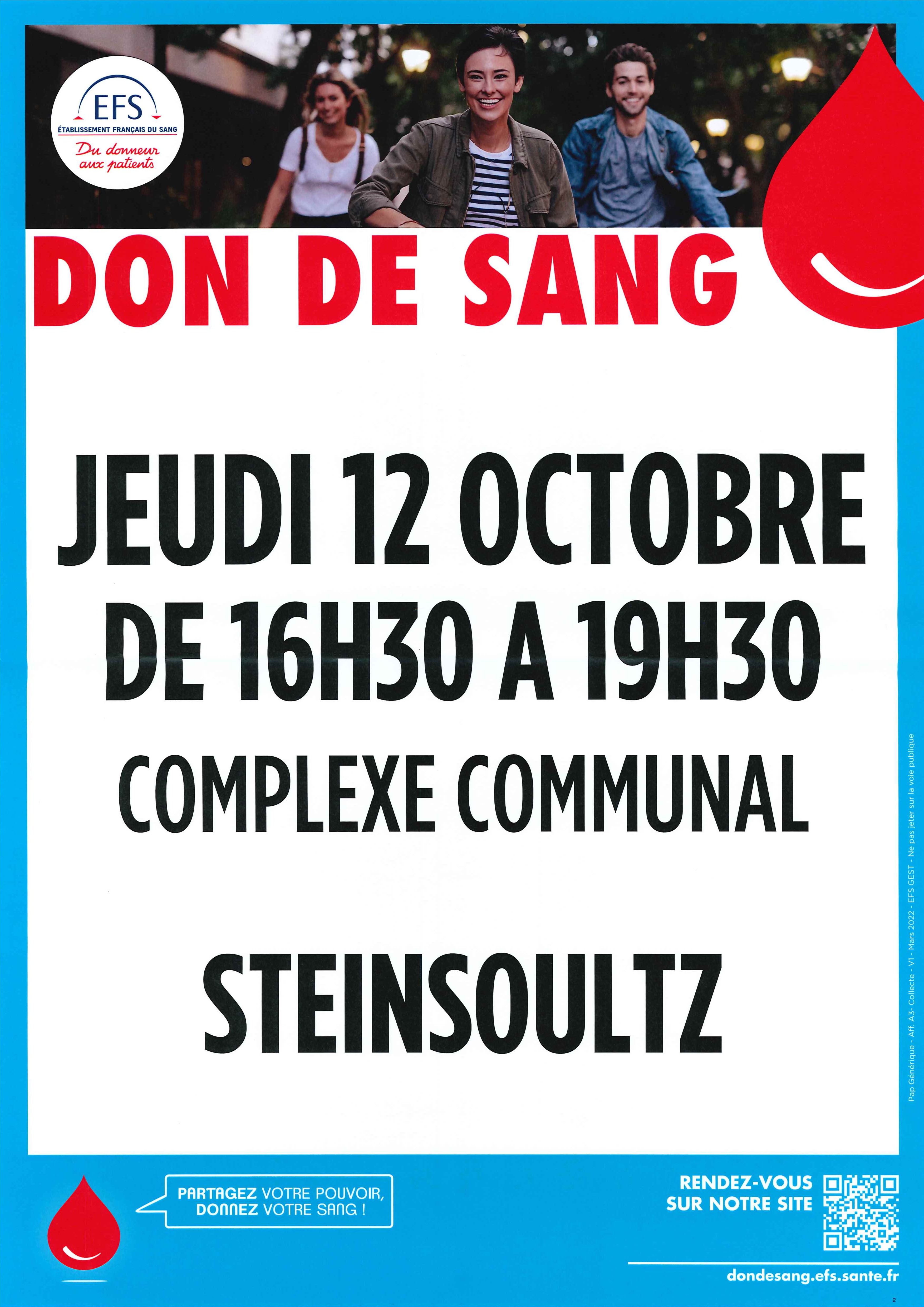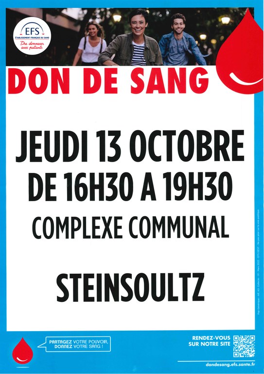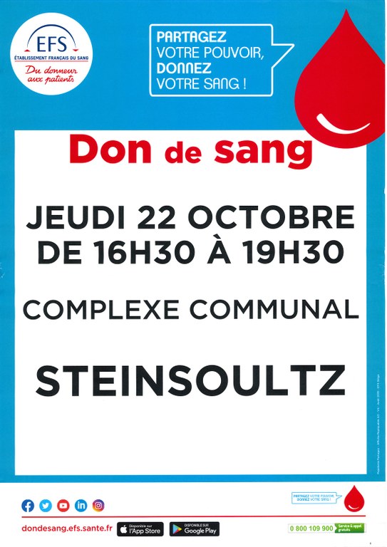 - L'Amicale des Donneurs de Sang organise une collecte de sang le jeudi 22 octobre 2020 au complexe communal de STEINSOULTZ