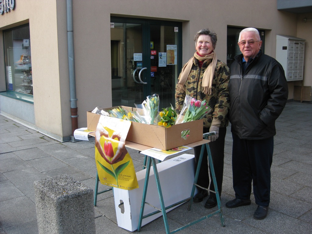 Photo de Mme Angèle Schur, Présidente des Donneurs de Sang et M. Julien Hirtzlin lors de l'opération Tulipes à Coeur.