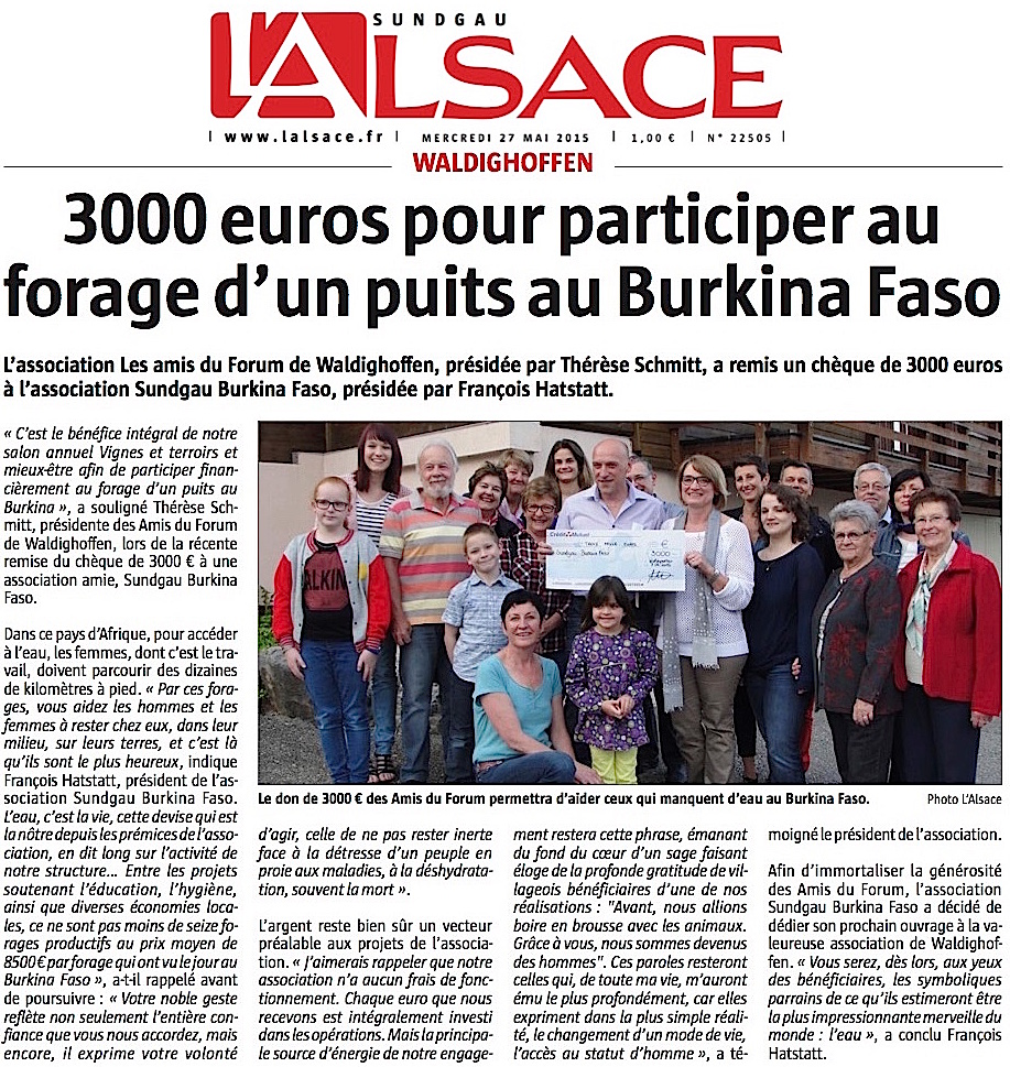Article de L'Alsace du 27 mai 2015 - 3000 eur pour un puits