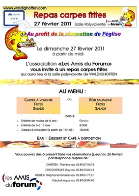 Fac-similé (p 1) du document distribué à l'occasion du Repas Carpes-Frites organisé par les "Amis du Forum" le 27 02 11 à la salle polyvalente de Waldighoffen