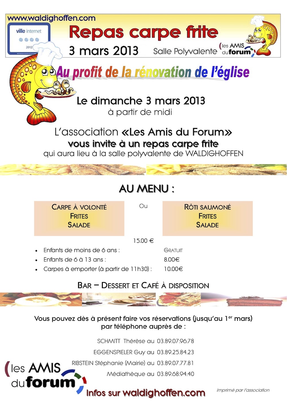 L'affiche pour annoncer le repas carpe frite 2013 des Amis du forum pour la rénovation de l'église.
