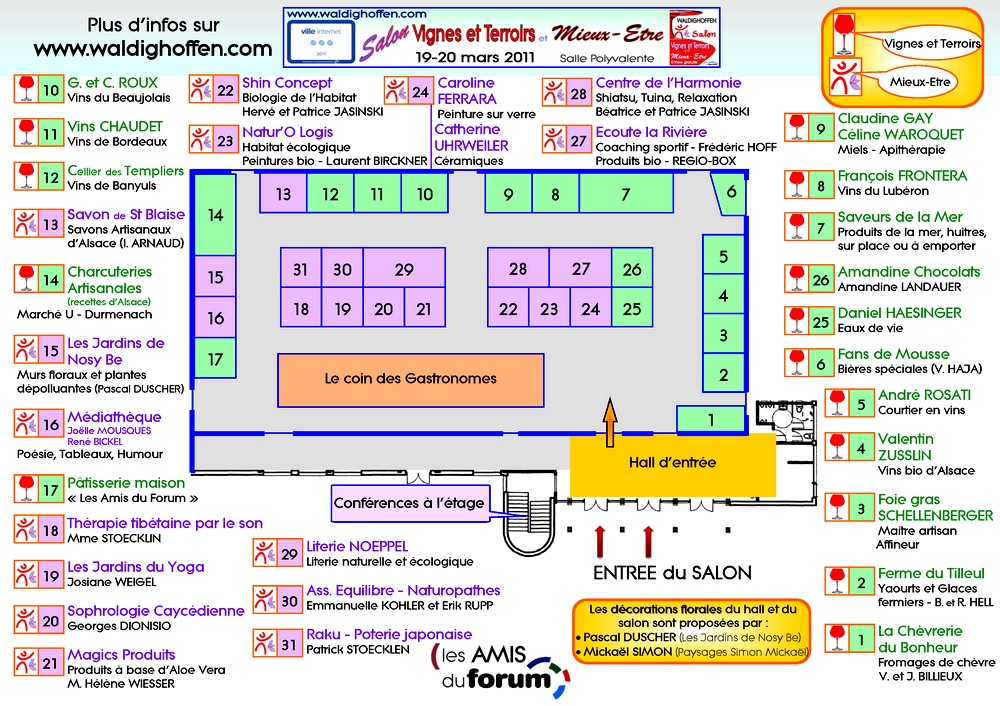 - Plan du Salon "Vignes et Terroirs et Mieux-Etre" à Waldighoffen les 19 et 20 mars 2011, avec l'emplacement et les coordonnées des Exposants (pages 2 et 3 du flyer)
