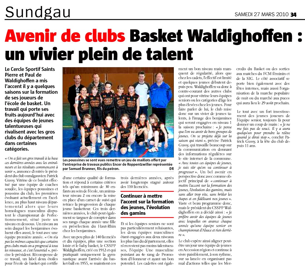 Article sur le basket-club CSSPP Waldighoffen dans le journal l'Alsace du samedi 27 mars.