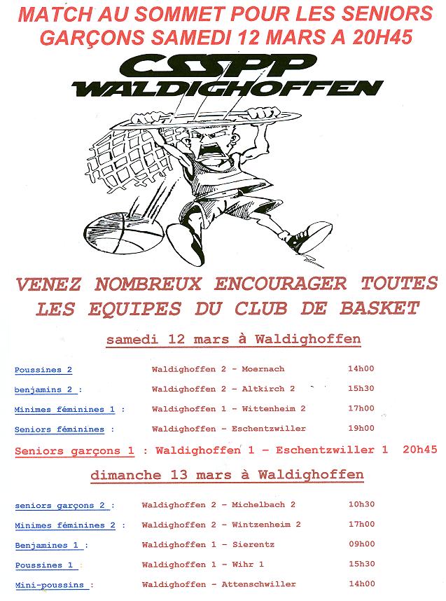 Affiche des rencontres de basket à Waldighoffen le samedi 12 mars 2011 à 20h45