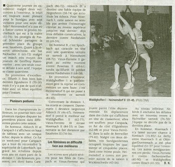 Photo parue dans les D.N.A. concernant la rencontre des seniors garçons 1 du basket-club CSSPP Waldighoffen contre Heimersdorf 2 du samedi 16 octobre.