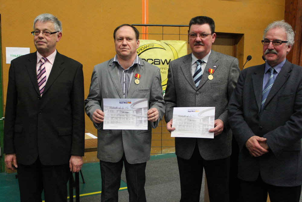 Les deux médaillés du jour entourés de Mrs Henri HOFF ( maire de Waldighoffen ) et Armand Rheinhard ( conseiller général du canton de Hirsingue ).