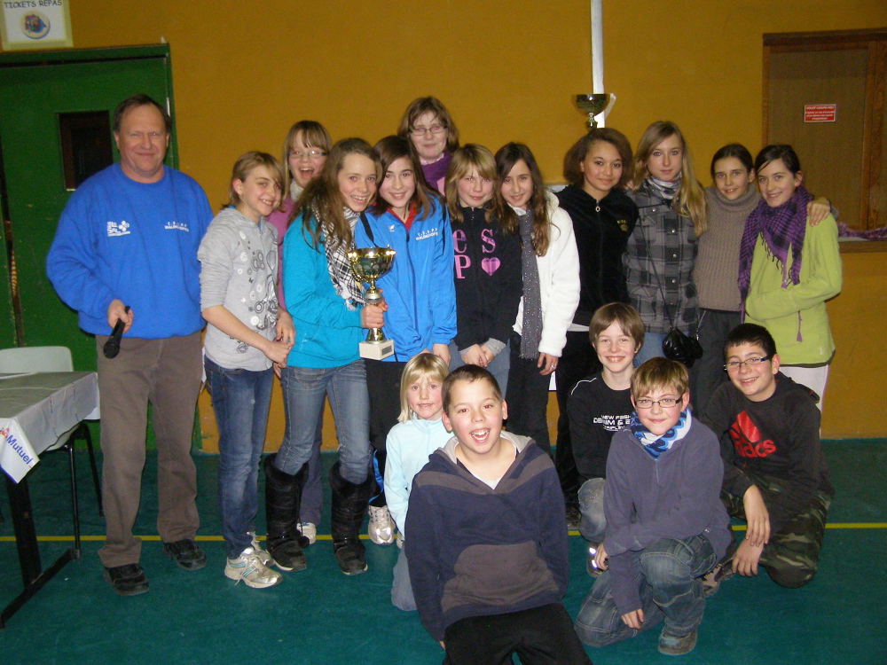 Les jeunes basketteurs reçoivent leur coupe des mains de leur président.