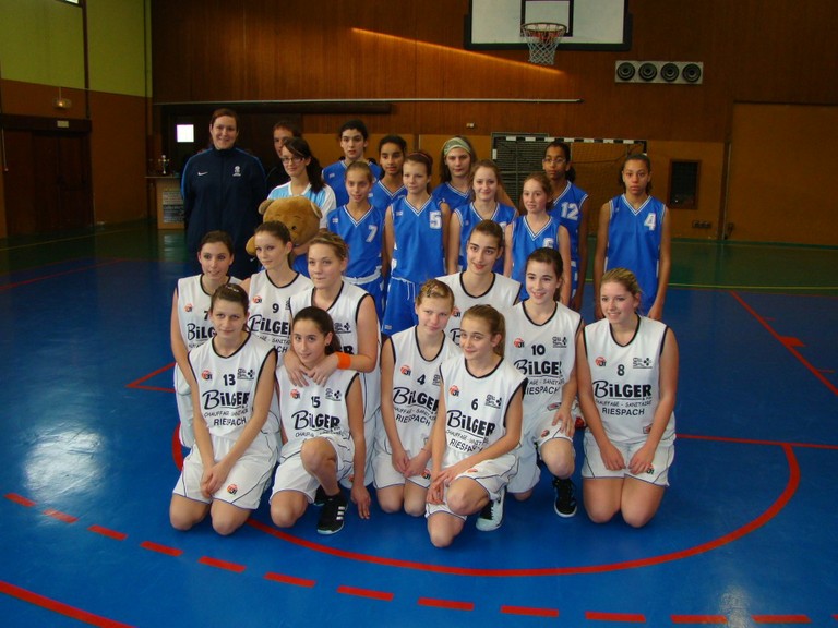 - Photo souvenir des 2 équipes : debout en bleu la sélection, accroupi en blanc les minimes région du basket-club CSSPP Waldighoffen.