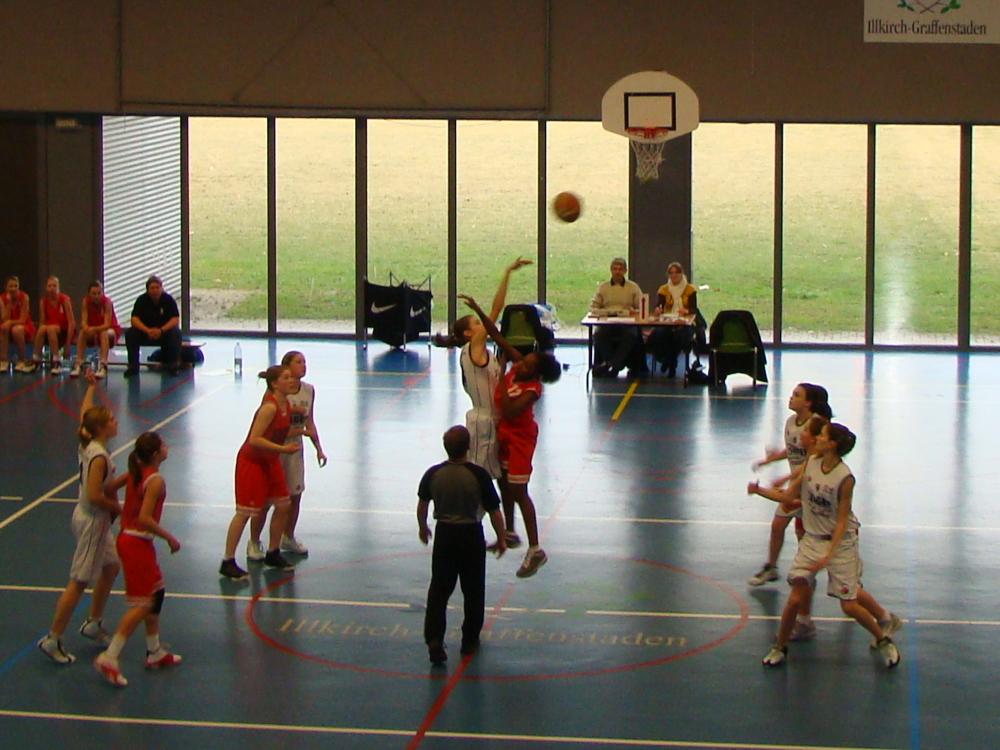 Entre-deux initial remporté par Mélanie Baumann qui saute plus haut que son adversaire.