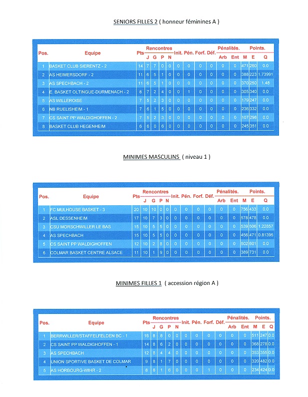 le classement des seniors féminines 2, minimes garçons et minimes féminines 1.