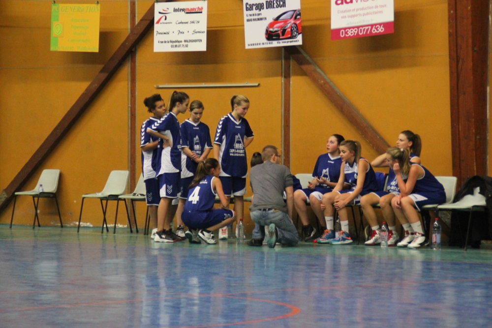 Les filles de Waldighoffen en bleues écoutent les consignes de Romain lors d'un temps-mort.