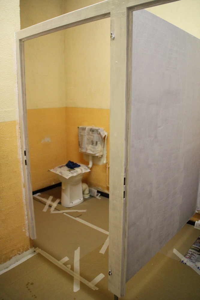 Vue après la première de peinture sur les séparations en bois des toilettes.