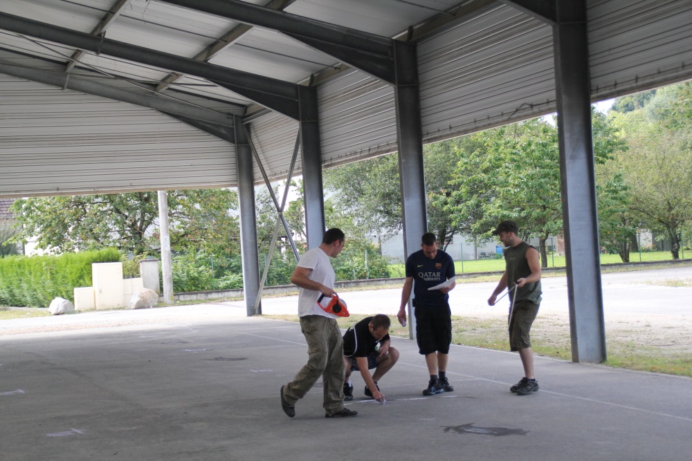 traçage des stands sous l'auvent de la salle.