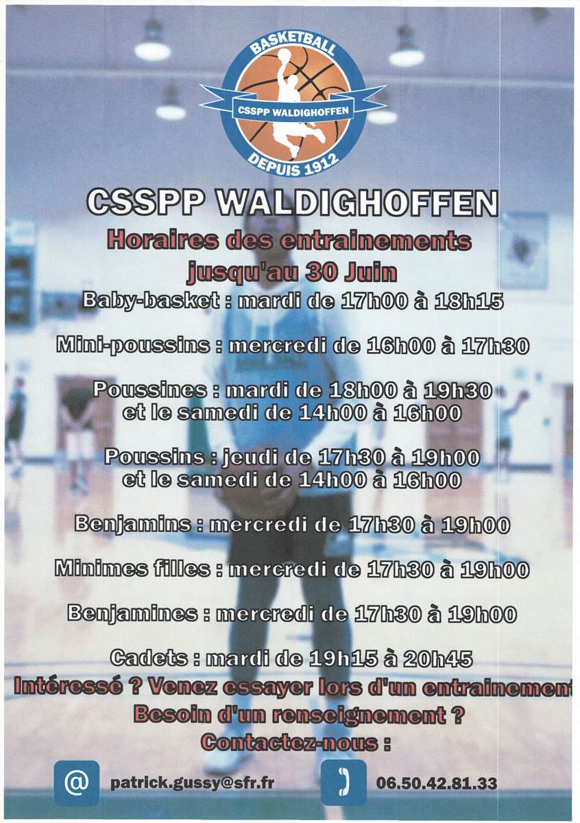 Affiche avec les créneaux de reprise des entrainements de basket au basket-club CSSPP Waldighofen.