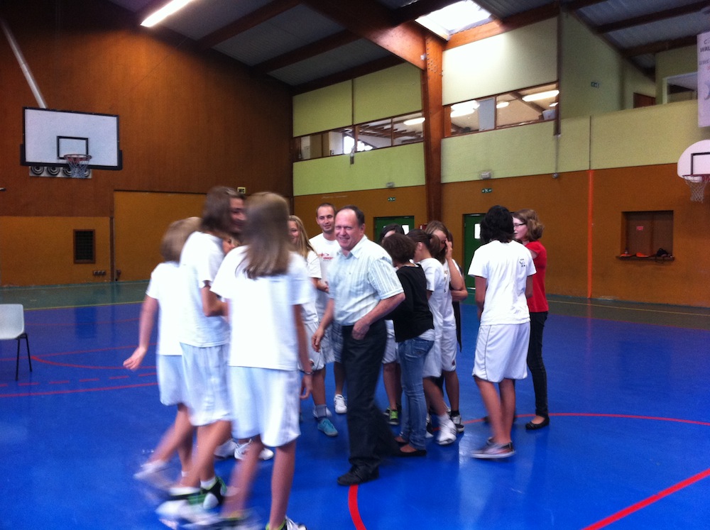 Les joueuses avec leur président après les discours, lors de la cérémonie de remise du sac de sport en souvenir de leur titre de championnes du Haut-Rhin 2011.