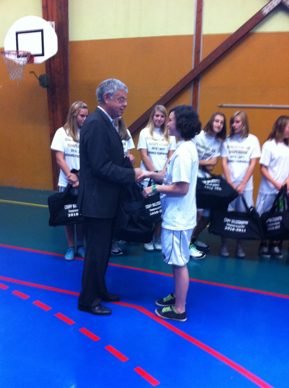 Monsieur le Maire remet son sac souvenir du titre de championne du Haut-Rhin 2011 à une joueuse du CSSPP basket de Waldighoffen.