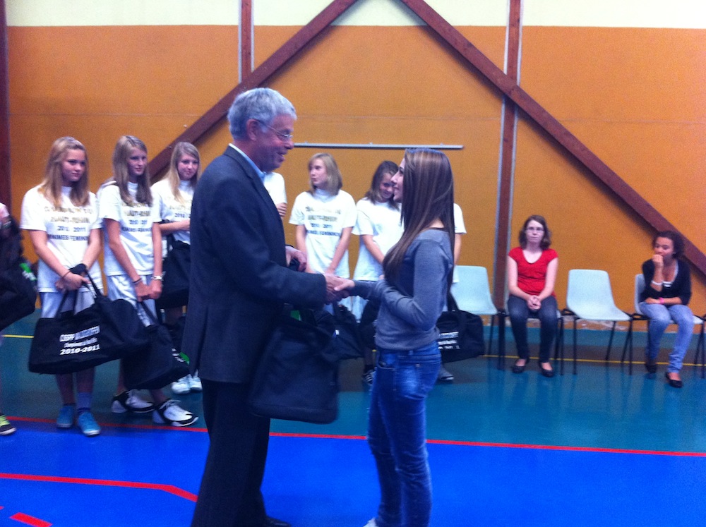 Monsieur le Maire remet son sac souvenir du titre de championne du Haut-Rhin 2011 à Pauline, une joueuse du CSSPP basket de Waldighoffen.