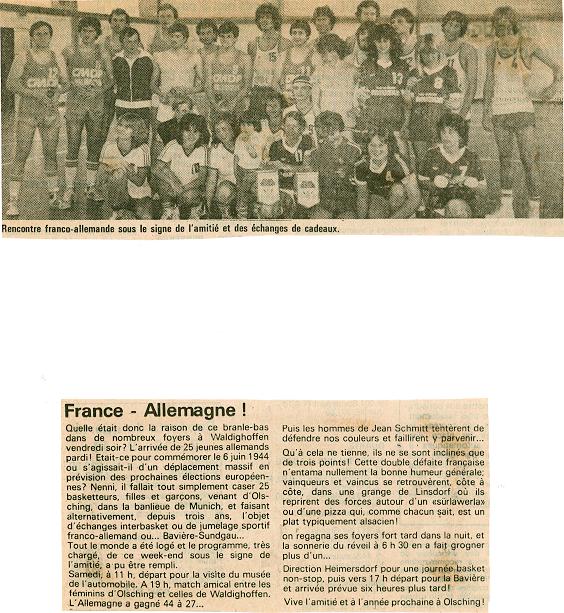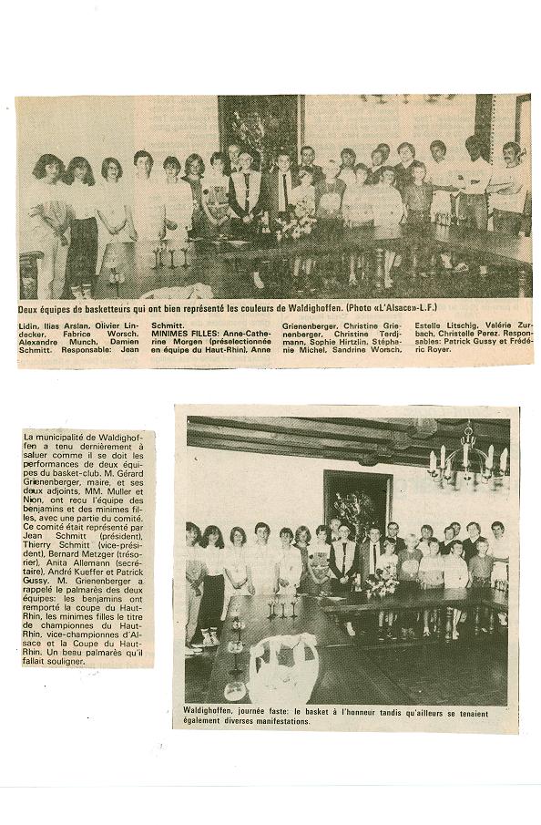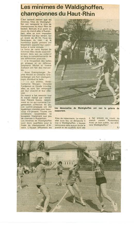 Article de presse concernant le premier match de basket en salle à Waldighoffen.