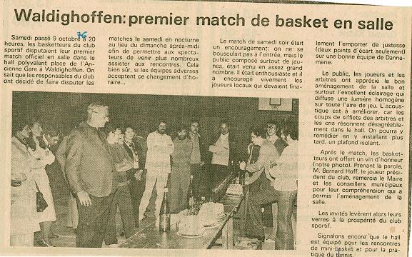 Article de presse concernant le premier match de basket en salle à Waldighoffen.