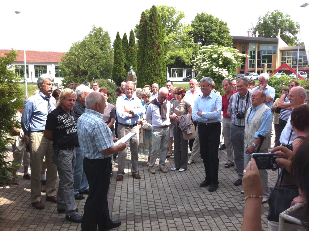 Par cette belle journée, l'assemblée écoute Joseph Haas devant le local du Cercle d'Histoire
