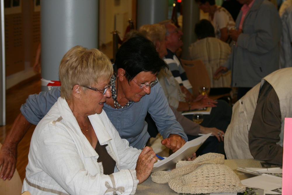Deux dames en pleine découverte des photos présentées à l'exposition Bin Ich Das 2011 du CHW de Waldighoffen.