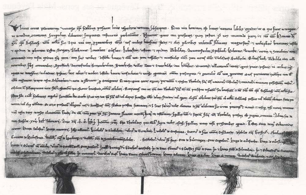 charte de la vente du comté de Ferrette par Ulrich II à l'évèque de Bâle le 15 janvier 1271 et reprise en fief.