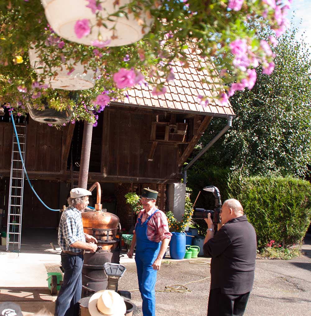 Prise de vue des personnages devant un alambic pour le film Le Schnaps du Cercle d'histoire de Waldighoffen et Jean-Paul Brobeck.