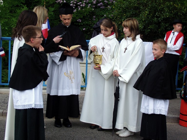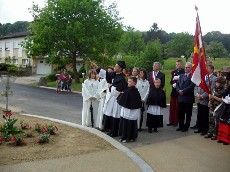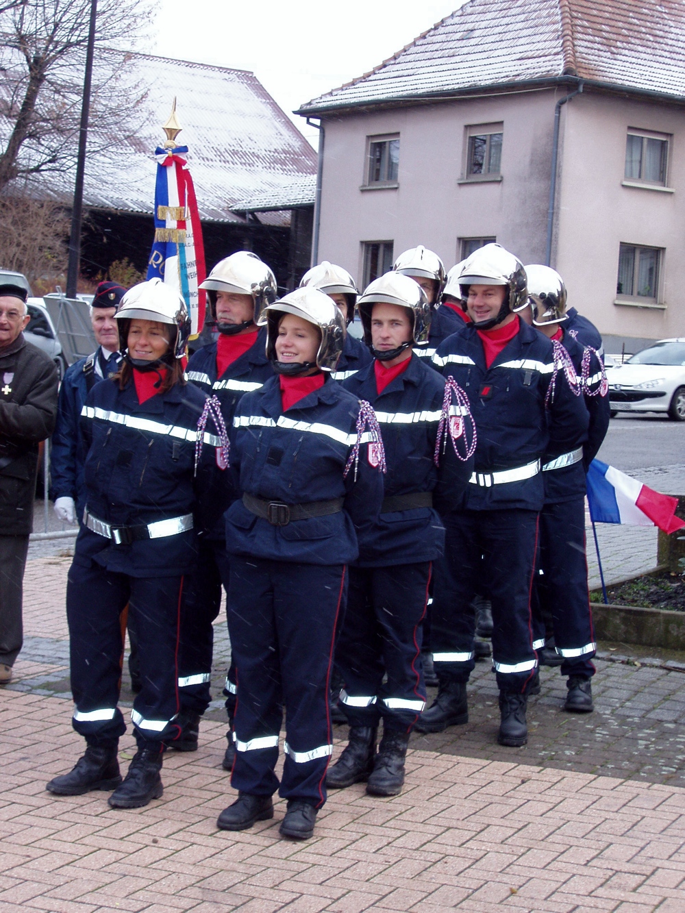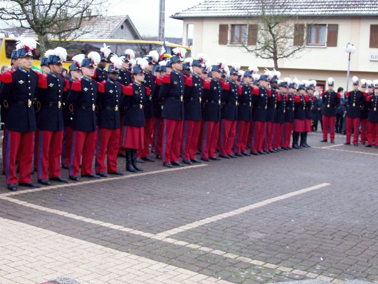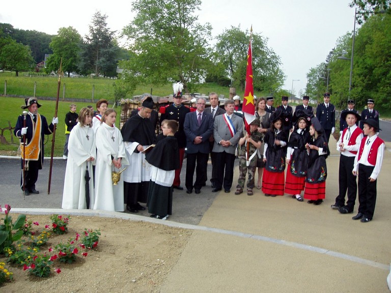 - Photo du corps des pompiers de Waldighoffen lors du pèlerinage de la Promotion de St Cyriens dans le Sundgau.