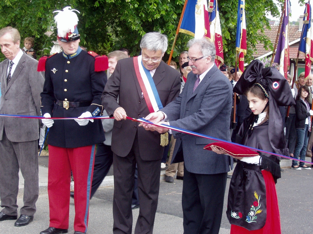 Photo du couper de ruban lors de l'inauguration du pont Lieutenant Jean de Loisy à Waldighoffen, inauguré le 08 mai 2009.