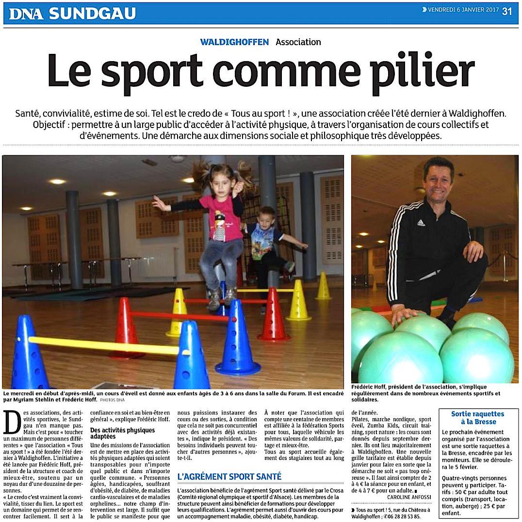 Vous êtes ici : Accueil Vie associative Les associations de Waldighoffen Espace Tous au Sport Waldighoffen Les articles de presse de Tous au Sport 2016/01/06 - DNA - Le Sport comme pilier